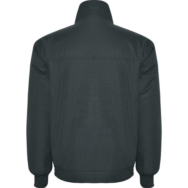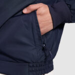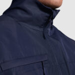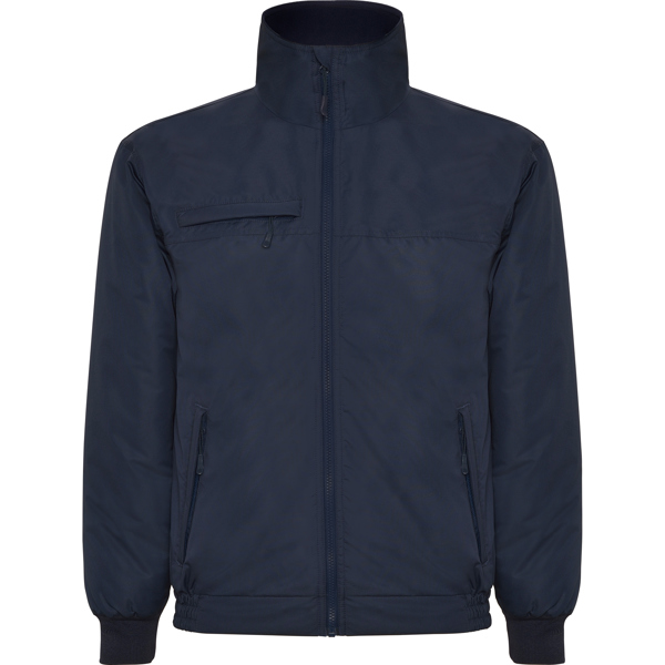 Casaco alcochoado impermeável. Fecho de correr central no mesmo tom, com protector de queixo e puxador no ziper. Gola alta com interior forrado em micropolar. Um bolso no peito e dois laterais com fecho e lapela. Punhos ajustáveis canelados 1×1. Acesso interior para execução de serigrafia ou bordado. Apropriado para o sector laboral.