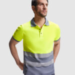Polo técnico de manga curta de alta visibilidade. · Gola e mangas caneladas 1×1 contrastantes. · Duas tiras segmentadas de alta visibilidade no peito. · Carcela com 3 botões contrastantes. · Tecido misto confortável em poliéster e algodão para maior respirabilidade.