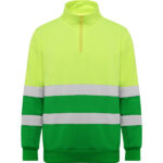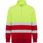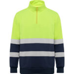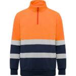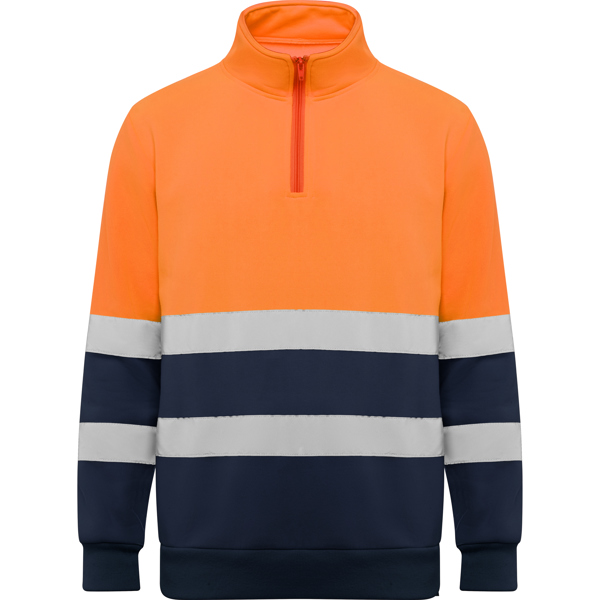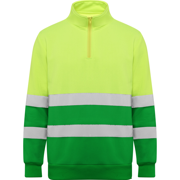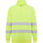 Sweat de alta visibilidade com meio fecho. · Gola alta, com protector do queixo e puxador no ziper. · Tapa costuras reforçado no interior da gola. · Faixas reflectoras horizontais no tronco e mangas. · Ponto canelado 1×1 nos punhos e cós.